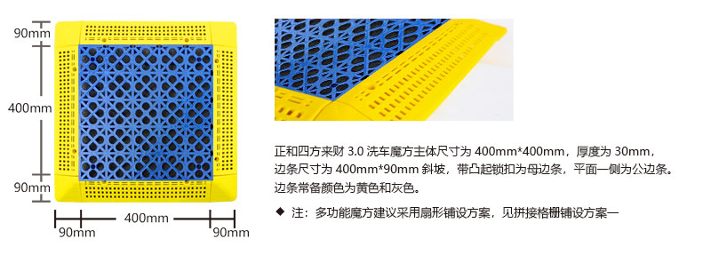 1. 分為3.4.5.厚度,解決不同厚度,統(tǒng)一紋路的問題 2. 啞光平紋設(shè)計(jì),防滑,美觀,易清潔 3. 選用高級原料,加入其他輔料,顏色亮麗,無異味,無污染 4. 顏色為紅黃藍(lán)綠黑灰六色,滿足客戶用色需求,搭配屬于自己的風(fēng)格 5. 通扣鎖扣設(shè)計(jì),容易鋪設(shè)且容易拆卸打理 6. 加強(qiáng)支撐,不容易出現(xiàn)壓壞壓斷現(xiàn)象,滿足大多數(shù)車輛施工的要求 7. 使用年限長,五年超長質(zhì)保,使用無后顧之憂 8. 十字支撐,保證承載最大化的同時(shí),且易排泥排水