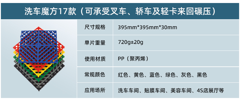 正和17款洗車魔方具有大孔徑排水和排泥沙的功能,下方支撐空間更大,鎖扣更加牢固,鋪裝方便快捷,效果美觀大方,解決了地下室、地暖系統(tǒng)的洗車難題,成為洗車車間地面的全新選擇。洗車魔方集玻璃鋼格柵的超強承載,排水排沙功能和拼接格柵的色彩絢麗,安裝方便功能于一身,是一款真正免挖溝一次性解決洗車間地面問題的超高性價比產品!