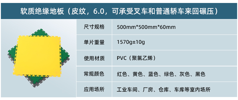 5、高承載,更防滑: 軟質(zhì)絕緣地板為實(shí)心結(jié)構(gòu),只要地面承重沒(méi)有問(wèn)題,其承載能力能夠達(dá)到每平米10噸以上。地板表面在生產(chǎn)過(guò)程中帶有凸起的紋路,讓車間地面更為防滑。