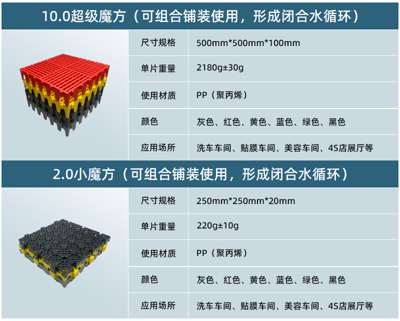 你以為60毫米厚度已經(jīng)是終點(diǎn)?正和100毫米厚度【終級(jí)魔方】再次刷新認(rèn)知!超強(qiáng)承載,極限容納泥沙量,嵌入式施工,讓洗車車間高效完美! 10公分終極魔方(50*50*10CM)與2.0小魔方(25*25*2CM)可組合鋪裝使用,形成閉合水循環(huán)