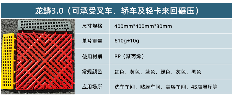 1.龍鱗紋設(shè)計(jì),防滑,美觀,寓意好 2.選用高級(jí)原料,加入其他輔料,顏色亮麗,無異味,無污染 3.顏色為紅黃藍(lán)綠黑灰六色,滿足客戶用色需求,搭配屬于自己的風(fēng)格 4.通扣鎖扣設(shè)計(jì),容易鋪設(shè)且容易拆卸打理 5.加強(qiáng)支撐,不容易出現(xiàn)壓壞壓斷現(xiàn)象,滿足大多數(shù)車輛施工的要求 6.使用年限長,3年超長質(zhì)保,使用無后顧之憂 7.不同厚度,采用不同支撐,保證承載最大化的同時(shí),且易排泥排水